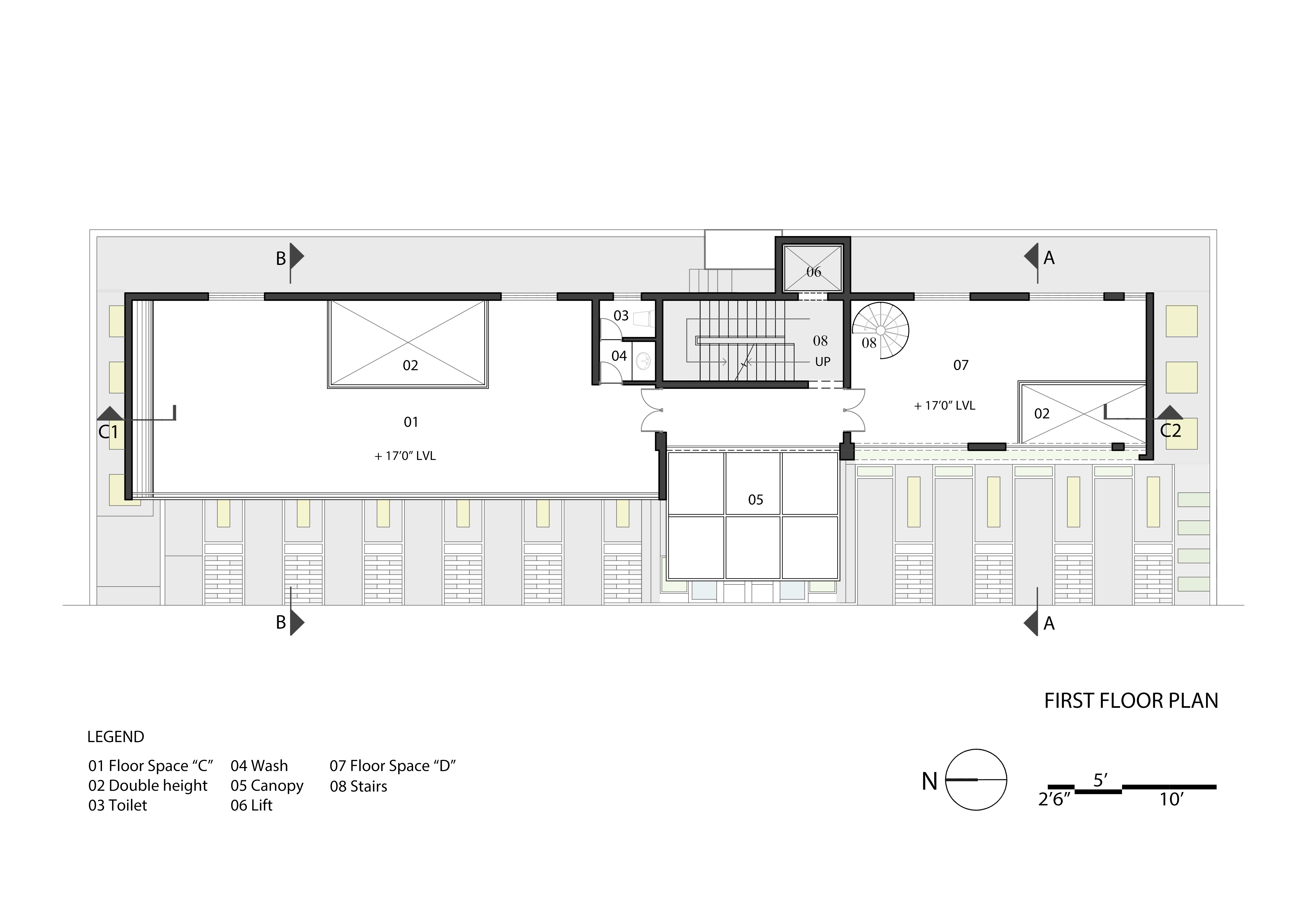 The North West portion is cantilevered to maximize the floor area. The cantilevered portion provides shade to the spaces in the ground